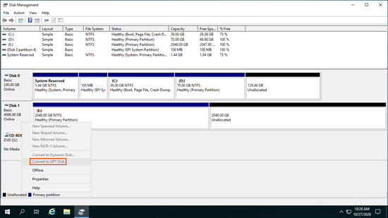 Assim como nas versões anteriores, o Windows 10 possui o Gerenciamento de Disco integrado, que tem a opção de "Converter MBR para GPT" e "Converter disco GPT para MBR". No entanto, não deve haver nenhuma partição neste disco. Se houver sequer uma partição, a opção "Converter para Disco GPT" fica esmaecida no Gerenciamento de Disco do Windows 10.
