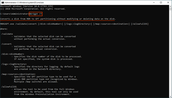 O MBR2GPT validará o layout da partição do disco antes de converter, se a validação falhar, a conversão não continuará, portanto, não causará nenhum dano ao seu disco. Se ele converter o disco com sucesso, as alterações não poderão ser desfeitas. Lembre-se, não há nenhuma ferramenta integrada do Windows capaz de converter GPT em MBR sem perder dados.