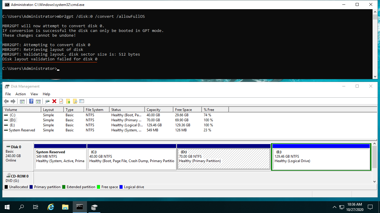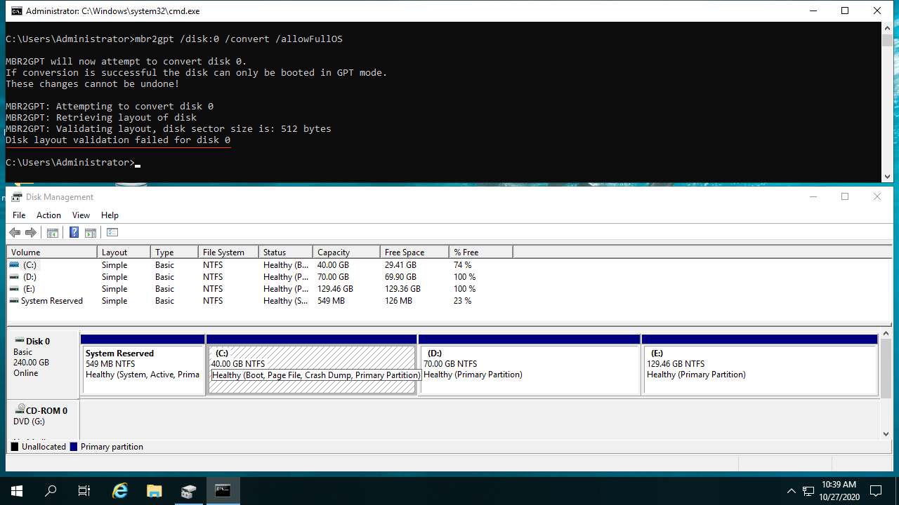 Algumas pessoas receberam o erro "A validação do layout do disco falhou para o disco 0" ao converter o disco com o MBR2GPT: