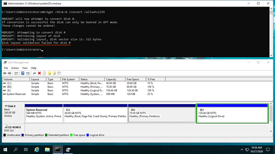 Como você pode ver nas capturas de tela, ao converter o disco MBR para GPT para o servidor Windows 2019, recebi o erro "A validação do layout do disco falhou para o disco 0". Porque há uma unidade lógica na primeira captura de tela e há 4 partições em ambas as capturas de tela.
