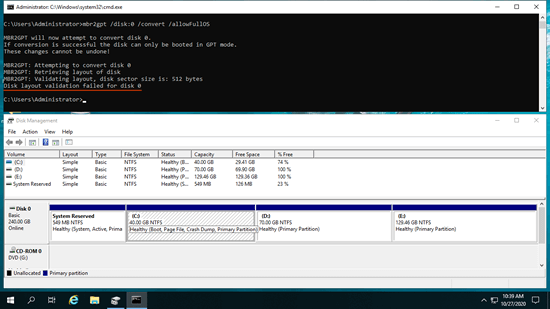 Você deve prestar mais atenção se quiser converter o disco do sistema para GPT, porque o sistema operacional e os programas estão instalados neste disco. Poucas ferramentas podem garantir 100% de inicialização do servidor e integridade após a conversão do disco do sistema de MBR para GPT. Portanto, é melhor fazer um backup com antecedência e executar o MBR2GPT no Server 2019, que é uma ferramenta de prompt de comando nativa. É muito fácil converter o disco com o comando MBR2GPT, mas o layout da partição do disco deve atender a alguns requisitos.