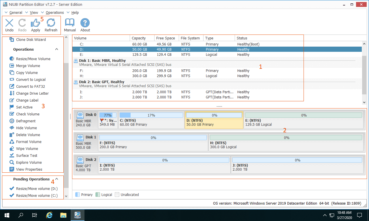 Baixar este software de partição no servidor Windows 2019 (máquina física ou virtual), você verá a janela principal com 5 seções.