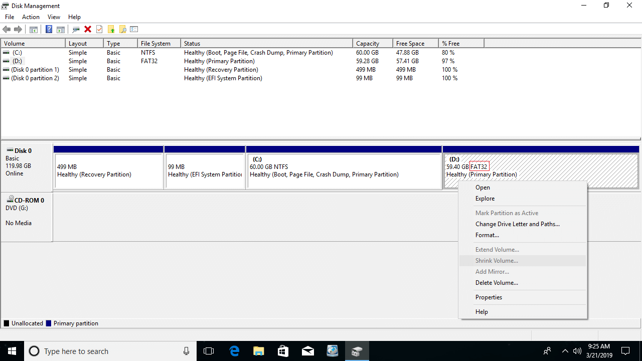Se você deseja reduzir uma partição FAT32, a opção Reduzir Volume está desabilitada no Gerenciamento de Disco do Windows 10/8/7. Nesse caso, você precisa executar um software de terceiros, como o NIUBI Partition Editor.