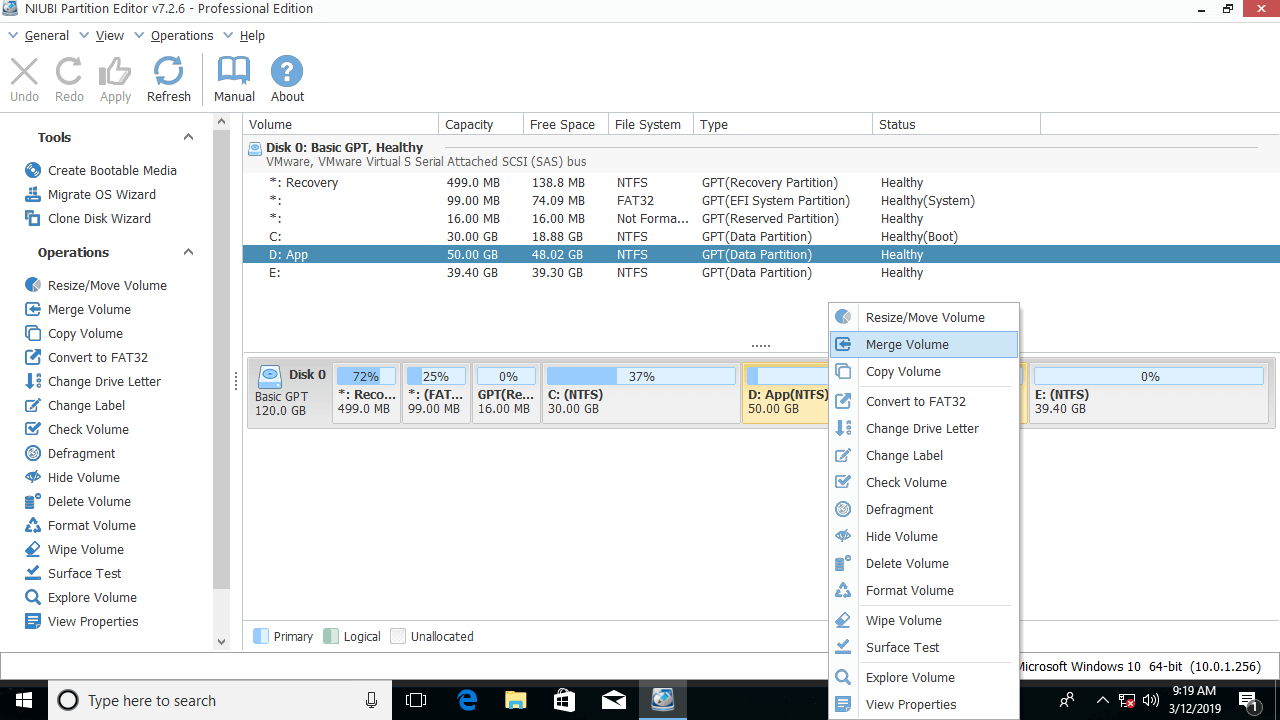 Passos para mesclar partições no Windows 10/8/7 com o NIUBI Partition Editor: