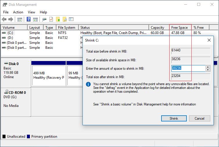 Como você pode ver no meu computador de teste, há 47,88 GB de espaço livre na unidade C, mas o Gerenciador de Disco me dá um máximo de 38226 (37,33 GB).