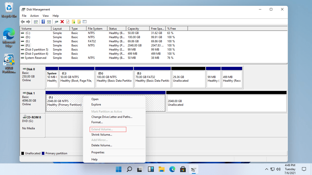 Em um disco MBR, as partições a serem excluídas e estendidas devem ser a mesma unidade Primária ou Lógica. Caso contrário, você não pode estender o volume no Windows 11 com o Gerenciamento de Disco mesmo após a exclusão.