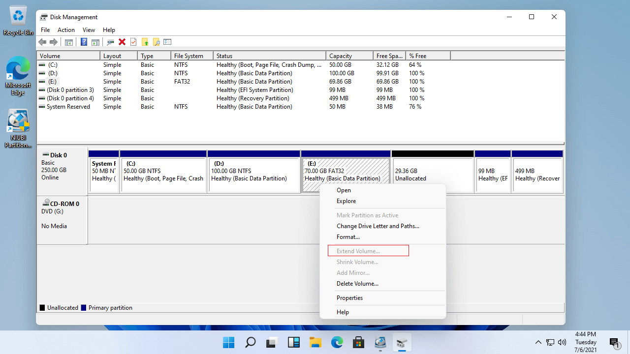 Como mostra a captura de tela, a opção Estender Volume está desabilitada para a unidade E, porque ela está formatada com FAT32.