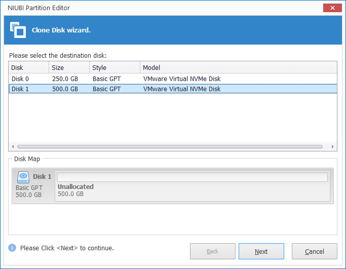 - Selecione o disco de destino na janela pop-up. Se houver partições no disco de destino, você receberá uma opção para excluir essas partições ou não. Somente quando você selecionar a opção de excluir a partição, poderá continuar a clonagem.