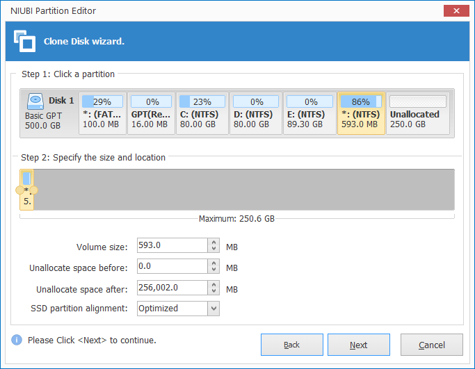 - Selecione o espaço não alocado no disco de destino e clique em Próximo.