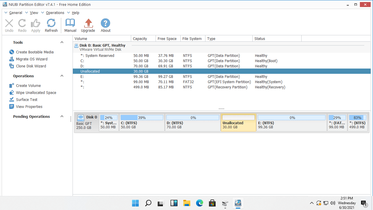 Baixar este gerenciador de partição gratuito, você verá todos os dispositivos de armazenamento com a estrutura da partição e outras informações na janela principal. Há 30GB de espaço não alocado que foi reduzido da unidade D.
