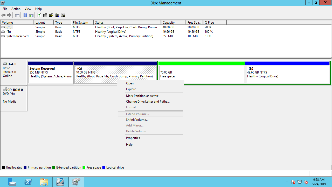 Passos para estender a unidade de partição do sistema no Windows Server 2012 R2: