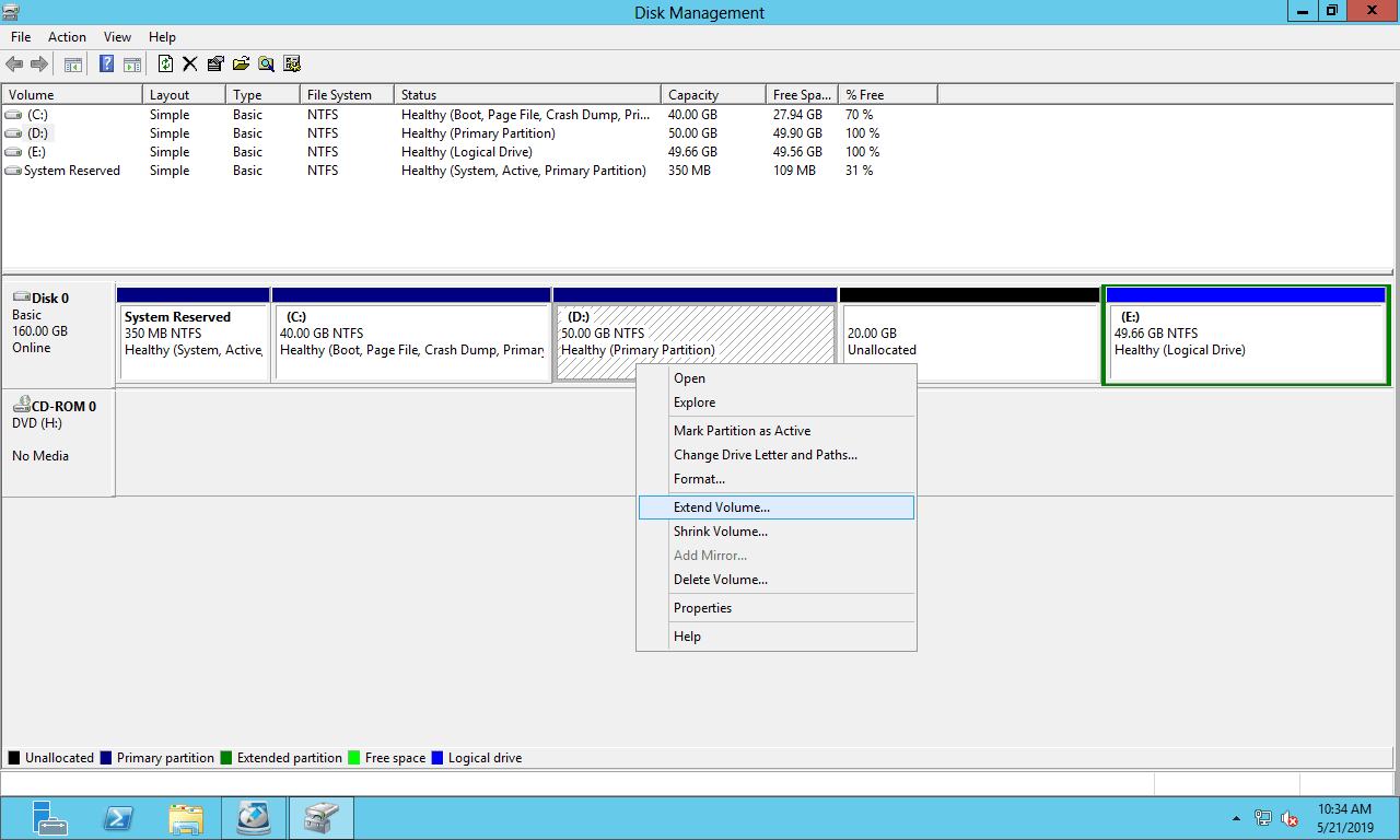 Como você vê no meu servidor, Estender Volume está desativado para essas partições.