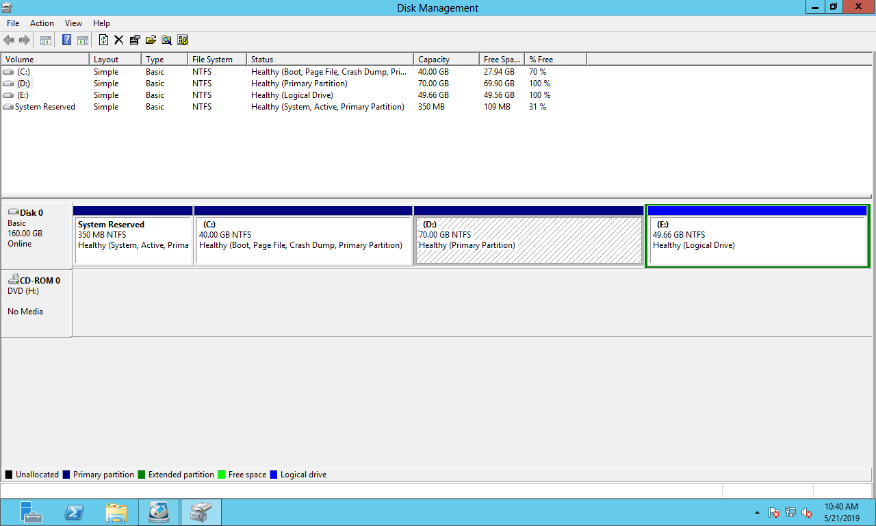 Quando a configuração da partição do disco atende aos requisitos e a partição adjacente direita pode ser excluída, é muito fácil estender a partição com o Gerenciamento de Disco. Siga os passos para estender o volume no Windows Server 2012/2016/2019/2022.