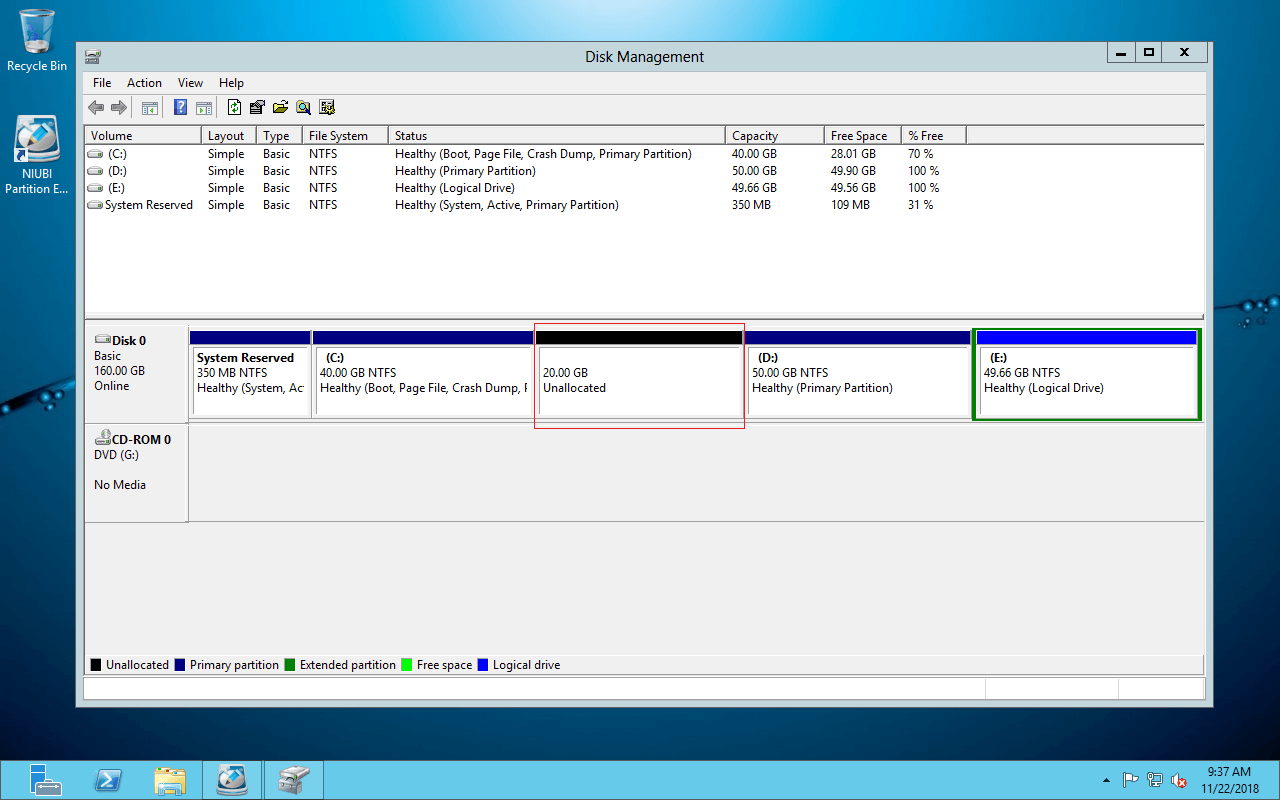 O Windows Server 2012 tem o recurso Diminuir Volume no utilitário de Gerenciamento de Disco integrado, que é capaz de diminuir a partição do sistema e quaisquer volumes de dados sem perder dados. É fácil, rápido e capaz de diminuir a partição sem reiniciar o servidor, mas, ao mesmo tempo, tem algumas restrições.