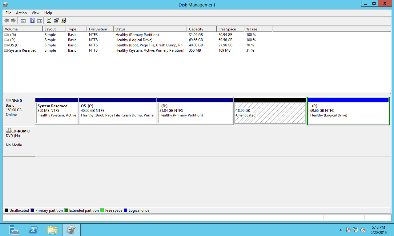 Como você vê no meu servidor de teste, Estender Volume está desativado para ambas as unidades C e E após diminuir D, porque Estender Volume só pode combinar espaço não alocado à partição contígua esquerda, todas as outras partições não podem ser estendidas.