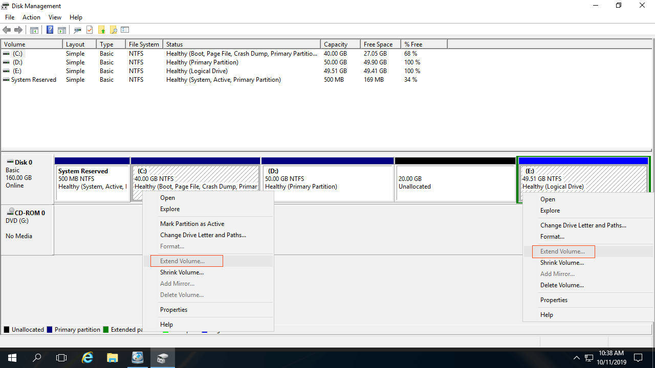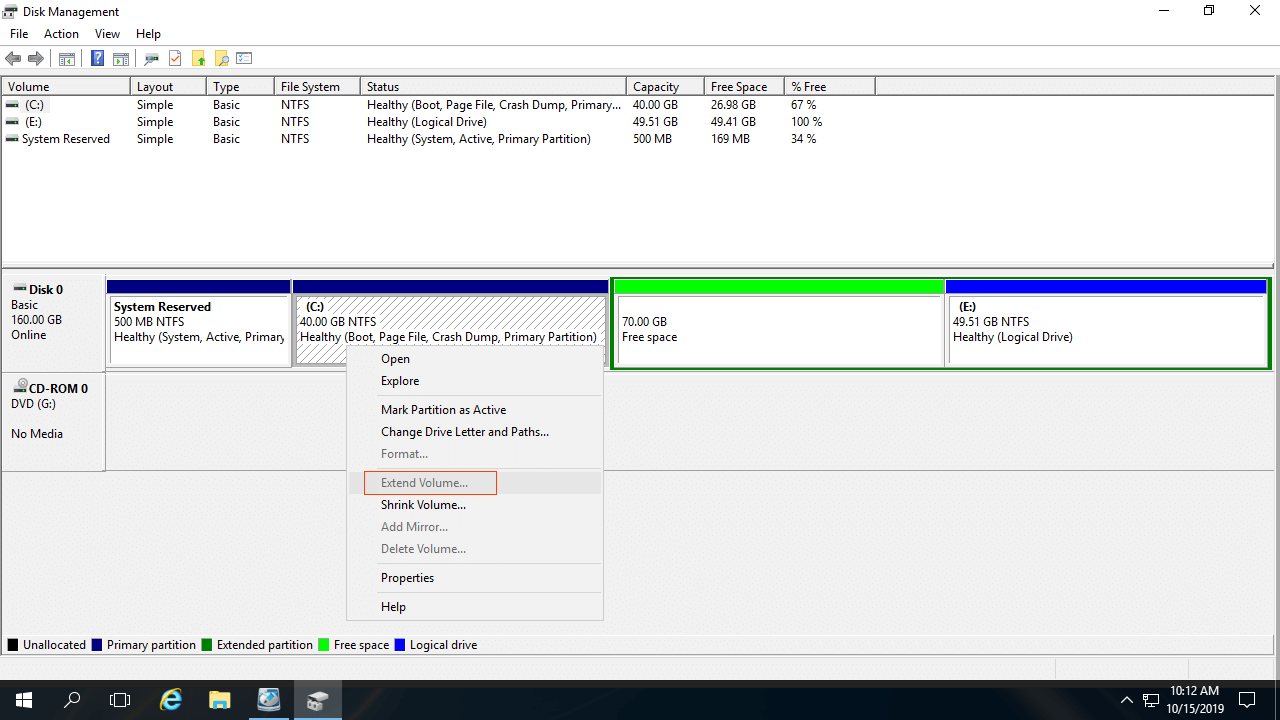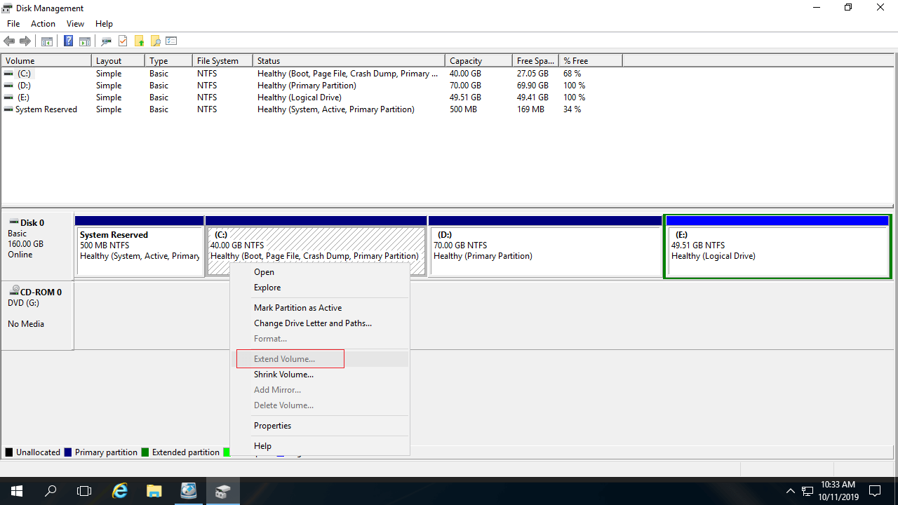 Este problema existe apenas em disco do tipo MBR. A maioria das unidades C: é partição primária, se a partição adjacente D for lógica, você não pode estender a unidade C no Gerenciamento de Disco do Server 2016, mesmo após excluir D.