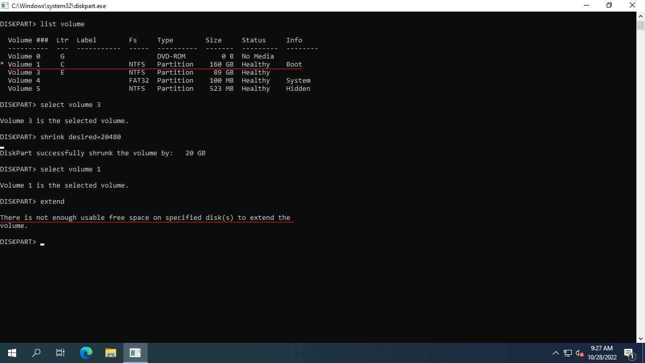 Diskpart extend failed